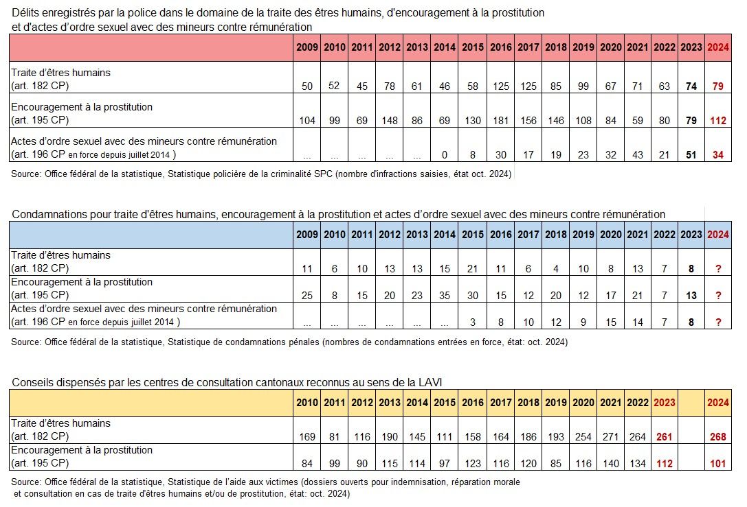 L'Office fédéral de la statistique fournit chaque année des chiffres sur les délits et les condamnations recensées pour traite des êtres humains ainsi que sur les conseils dispensés par les services officiels d'aide aux victimes. On estime que le nombre de cas non recensés est bien plus élevé.